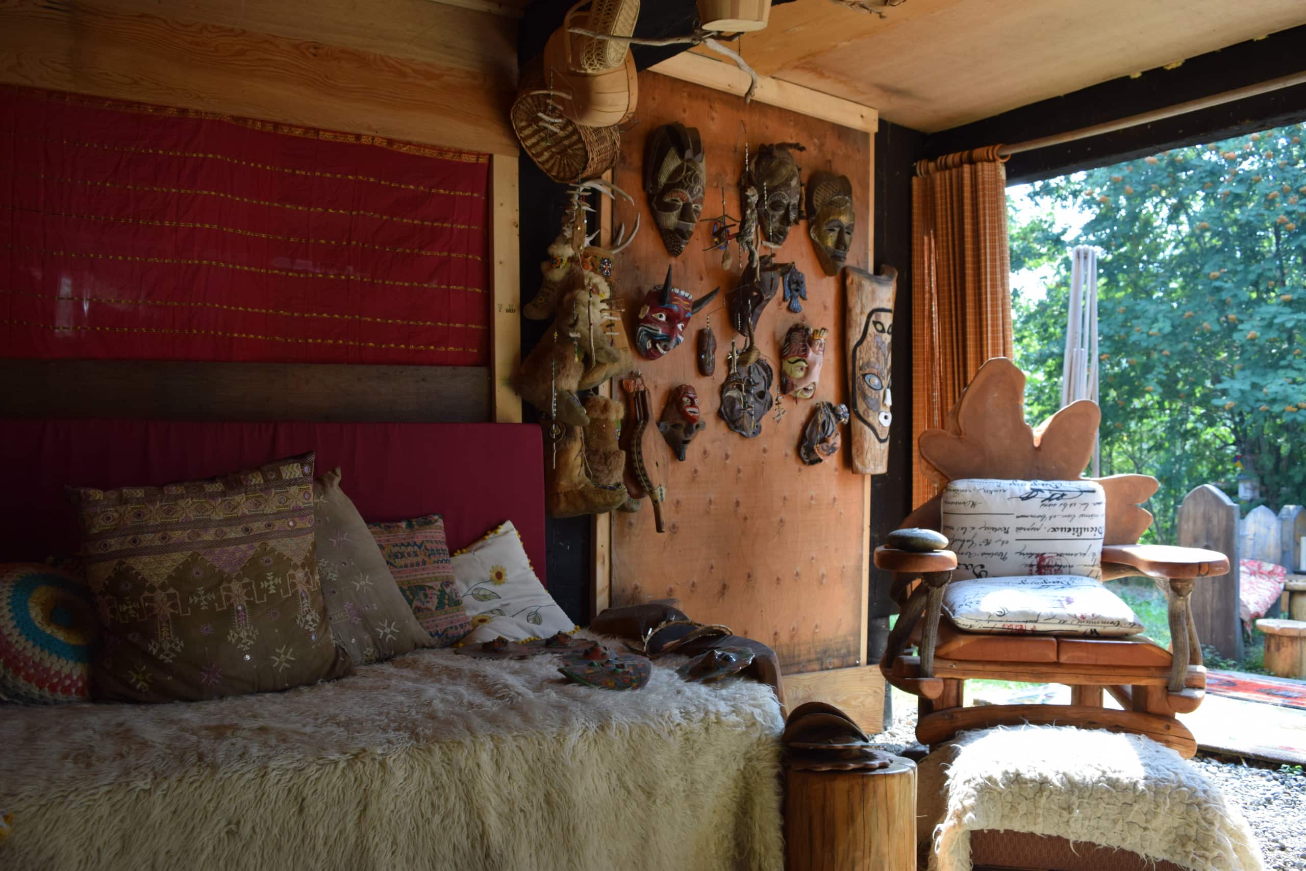 Handmade mobiles and tribal masks hang over plush benches covered in sheepskin and strewn with colourful pillows. Felt appliques line the walls and handwoven baskets hang in a line from the ceiling.