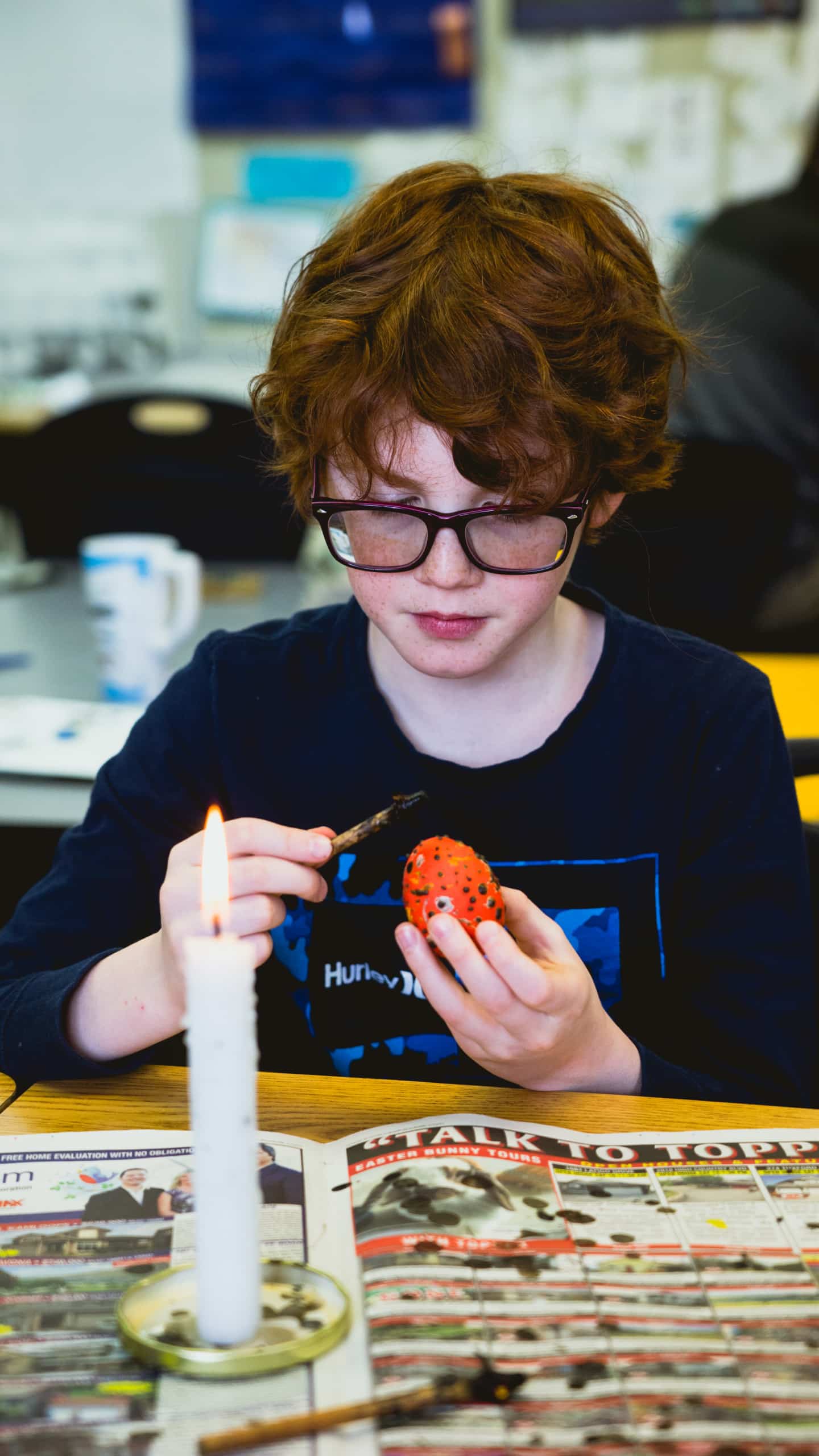 I went around the room snapping photos and talking with the students, they were all intensely immersed in the project, like nothing else could possibly be more exciting then coloring white eggs with ink and beeswax. This was a real treat for me to see, especially afterwards when Bankes explained he was shocked to see his most behaviourally challenging students were the most focused and concentrated during the workshop.