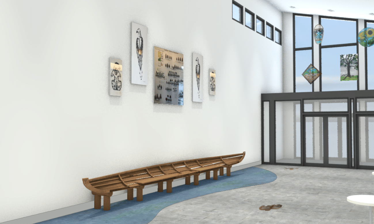 With input from the LSLB, the municipality chose artist Don Clarke to paint the selected pictographs and a river to run through the hall.