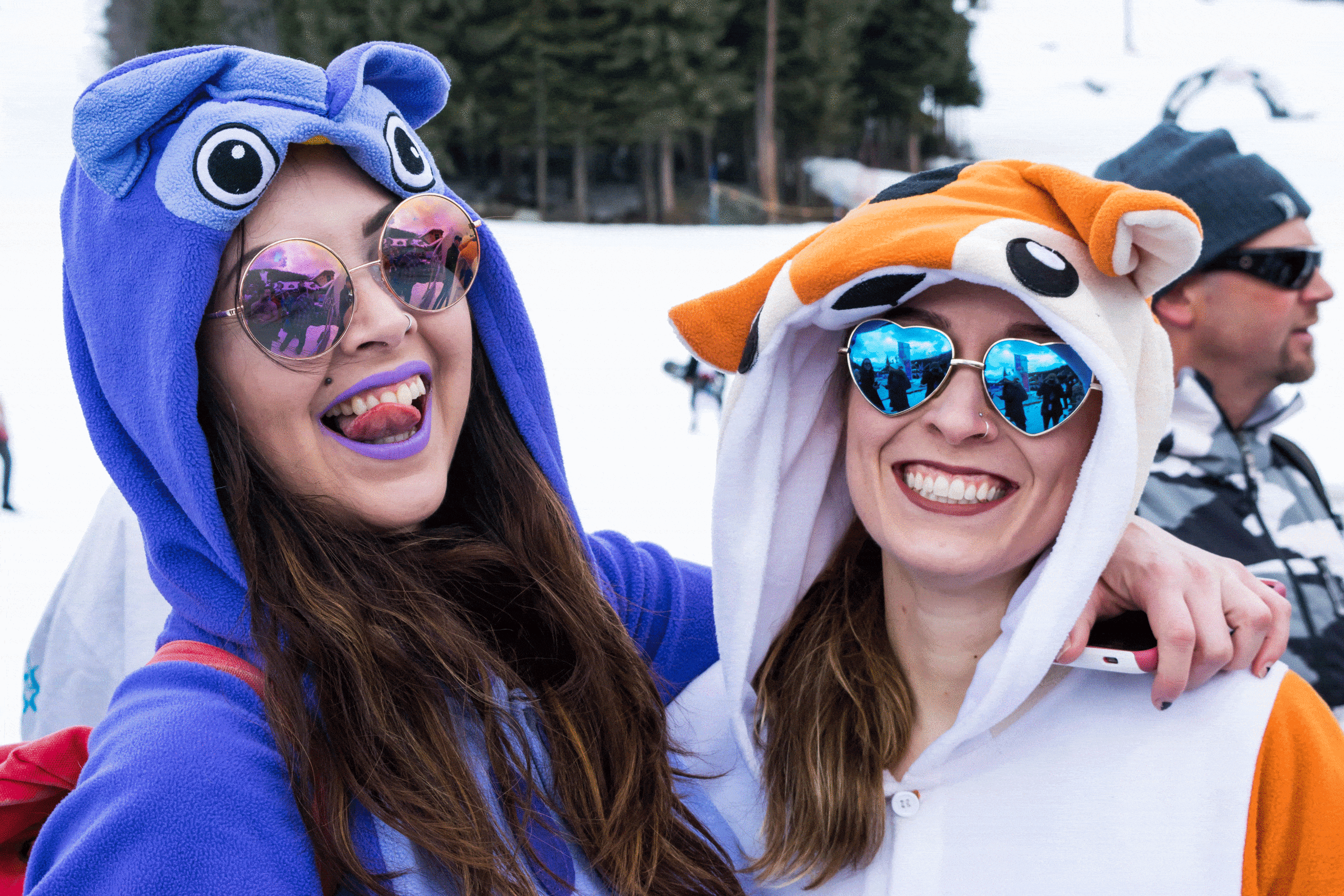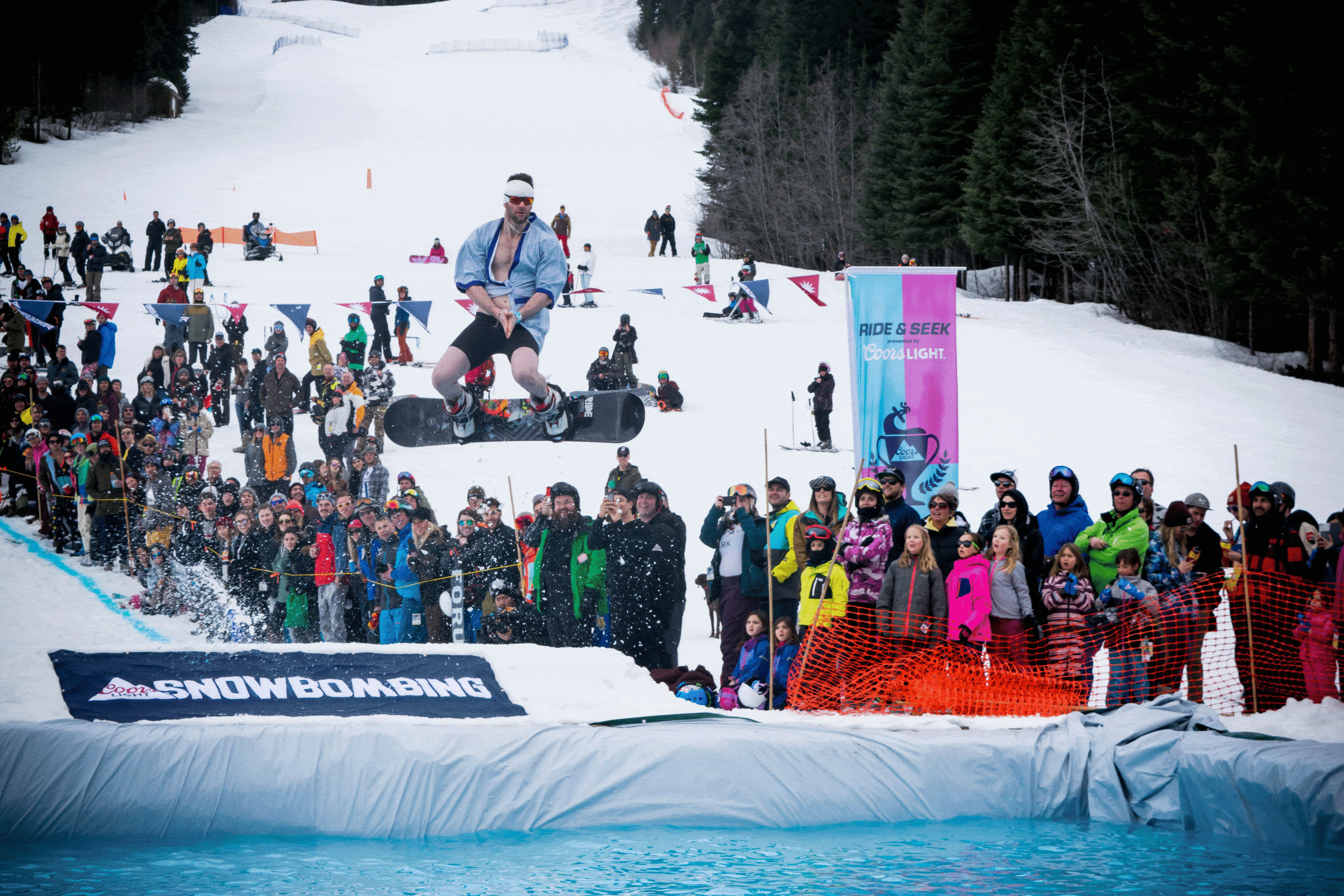 Day three of Snowbombing finally saw some sun, and it was just in the nick of time as contestants flew down a ramp into icy cold water in the Slush Cup. Ride and Seek, a series of events for festival goers, kicked off this morning with a big air contest followed by a rail jam, with Slush Cup finishing off the sporting events of the day. There were three winning categories: best costume, furthest distance, and best trick. Winners were prized with Burton and Coors Light swag.