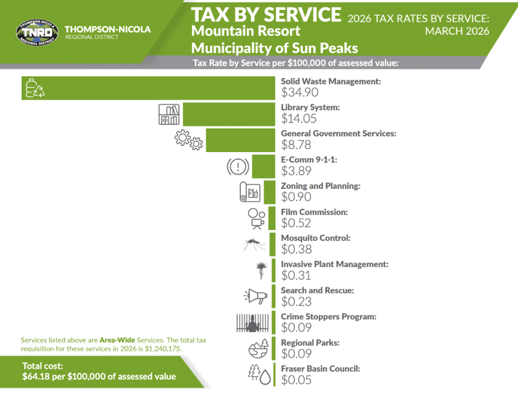 Homeowners in Sun Peaks will see a slight decrease in the TNRD property taxes from $562.68 to $562.38 on average; This is because the tax rate per $100,000 of assessed value decreased from last year. The BC Assessment for a typical single family home in Sun Peaks in 2026 came to just over $1,463,000, slightly down from $1,486,000 the previous year.