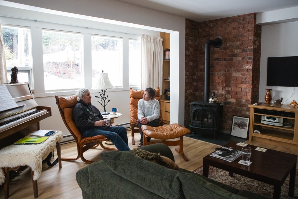 The original two bedrooms and bathroom were replaced by a loft and spacious seating area, with nothing but CBC Radio for entertainment. A basement was later dug out by hand, opening up space for bunk beds shared by his grandchildren. The last stage, completed by a contractor, added an en suite and ski entrance.